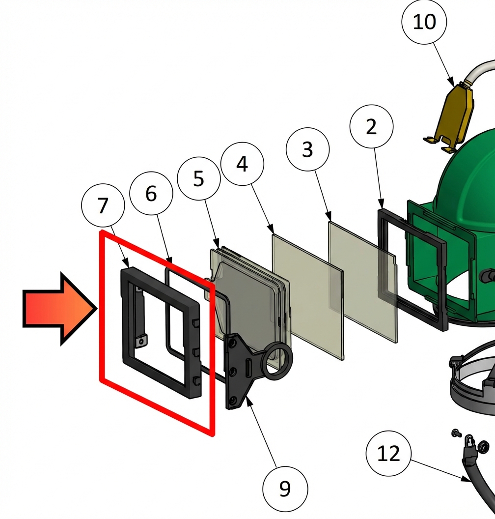 Ramka wizjera do Clemco Apollo 100 to oryginalny element montażowy zespołu szyb, który utrzymuje i dociska zestaw soczewek w hełmie (szybę wewnętrzną, zewnętrzną oraz folie ochronne). Zapewnia prawidłowe osadzenie uszczelnienia i stabilne zamknięcie wizjera podczas pracy w strumieniu ścierniwa.
